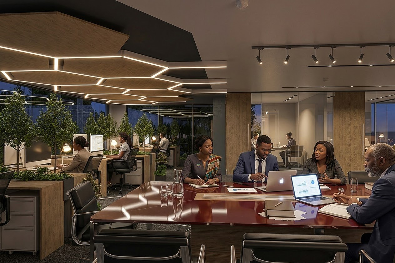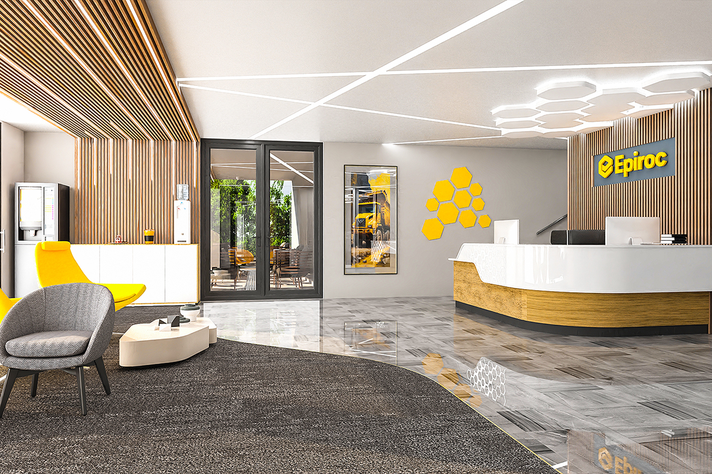 A visionary interior for the DRC Epiroc Branch, where refined modern finishes merge seamlessly with bespoke furniture installations — creating a sophisticated balance of elegance and practicality that redefines the space as a contemporary experience